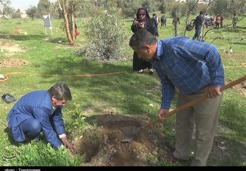 غرس یک اصله نهال زیتون توسط لاریجانی در روز درختکاری