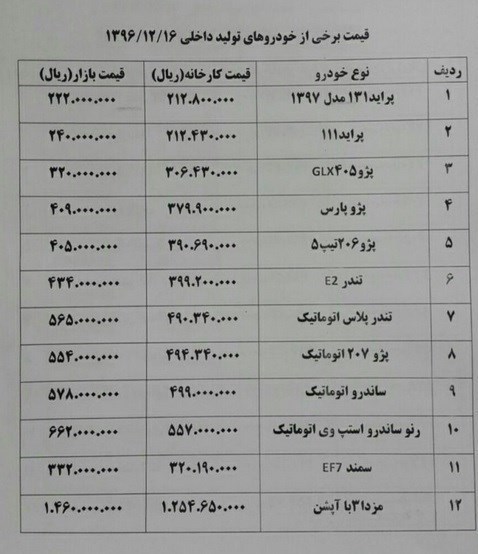 پژو206 تیپ 2 هم با کاهش 200 هزار تومانی با قیمت 35 میلیون و 700 هزار تومان، پژو 205 تیپ 5 با کاهش 400 هزار تومانی با قیمت 40 میلیون و 400 هزار تومان، پژو 206 صندوق دار با کاهش 700 هزار تومانی با قیمت 41 میلیون و 300 هزار تومان، پژو پارس با کاهش 500 هزار تومانی با قیمت 40 میلیون و 500 هزار تومان مورد معامله قرار میگیرد.