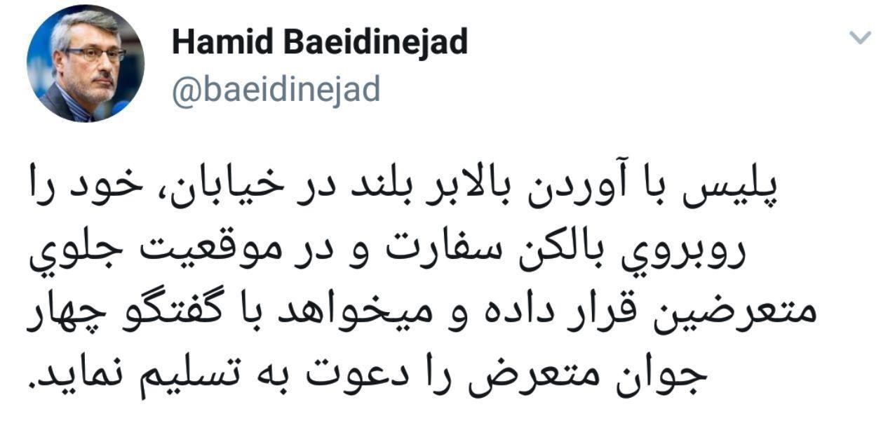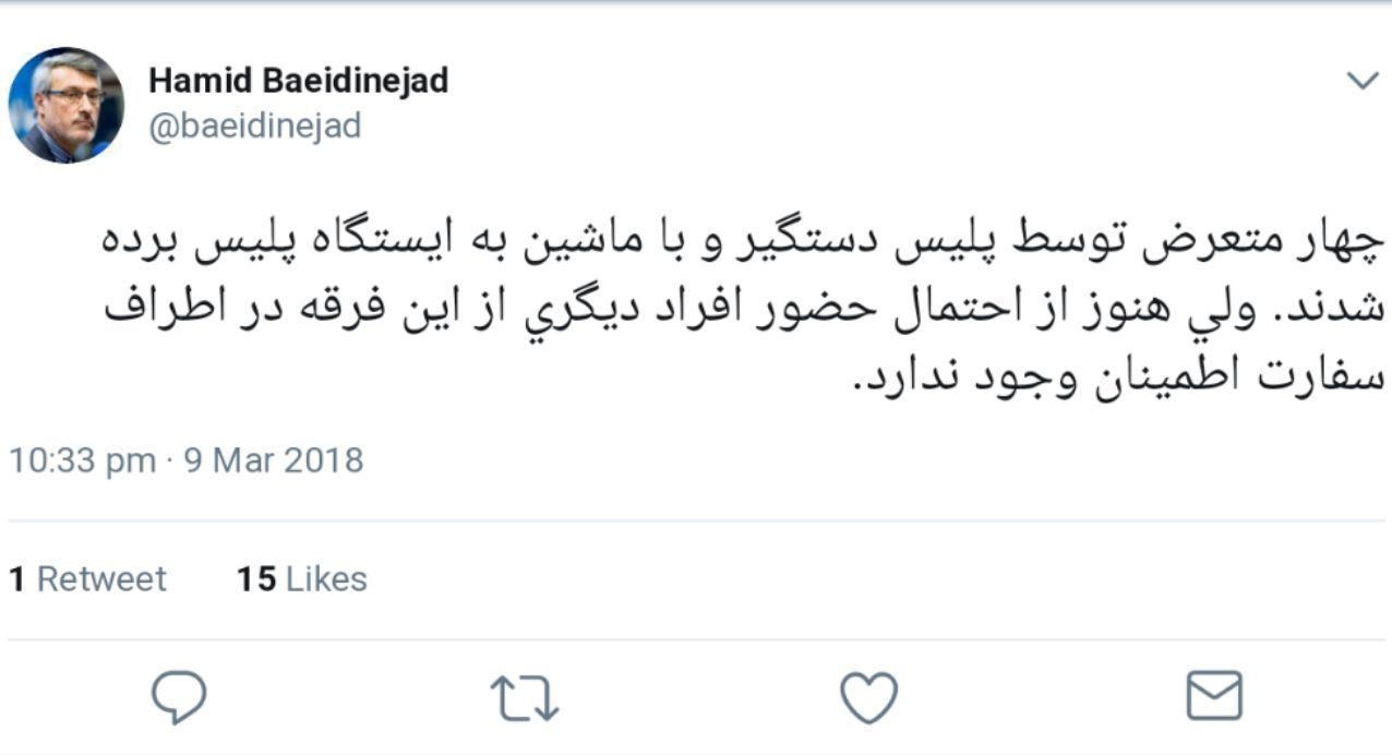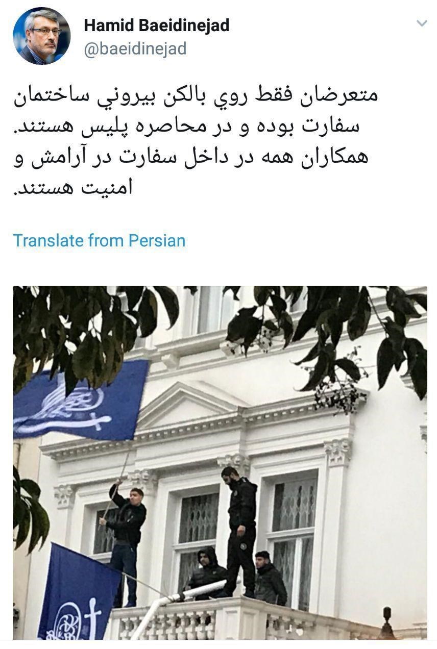 به گزارش حوزه سیاست خارجی خبرگزاری تسنیم، در پی ورود چند نفر از هواداران یک فرقه تندروی مقیم انگلیس به بالکن سفارت جمهوری اسلامی ایران در لندن و اهانت به پرچم مقدس کشورمان «حمید بعیدی نژاد» سفیر ایران در انگلیس در حساب توئیتری خود نوشت: دقایقی پیش تعداد اندکی به سفارت جمهوری اسلامی ایران در لندن تعرض کردند و با شکستن پرچم در حال شعار علیه مقامات کشور و لعن عایشه، ابوبکر، عمر و عثمان هستند. به هنگام ورود آنها با چماق و قمه دیده شدند. پلیس در محل حاضر شده است.