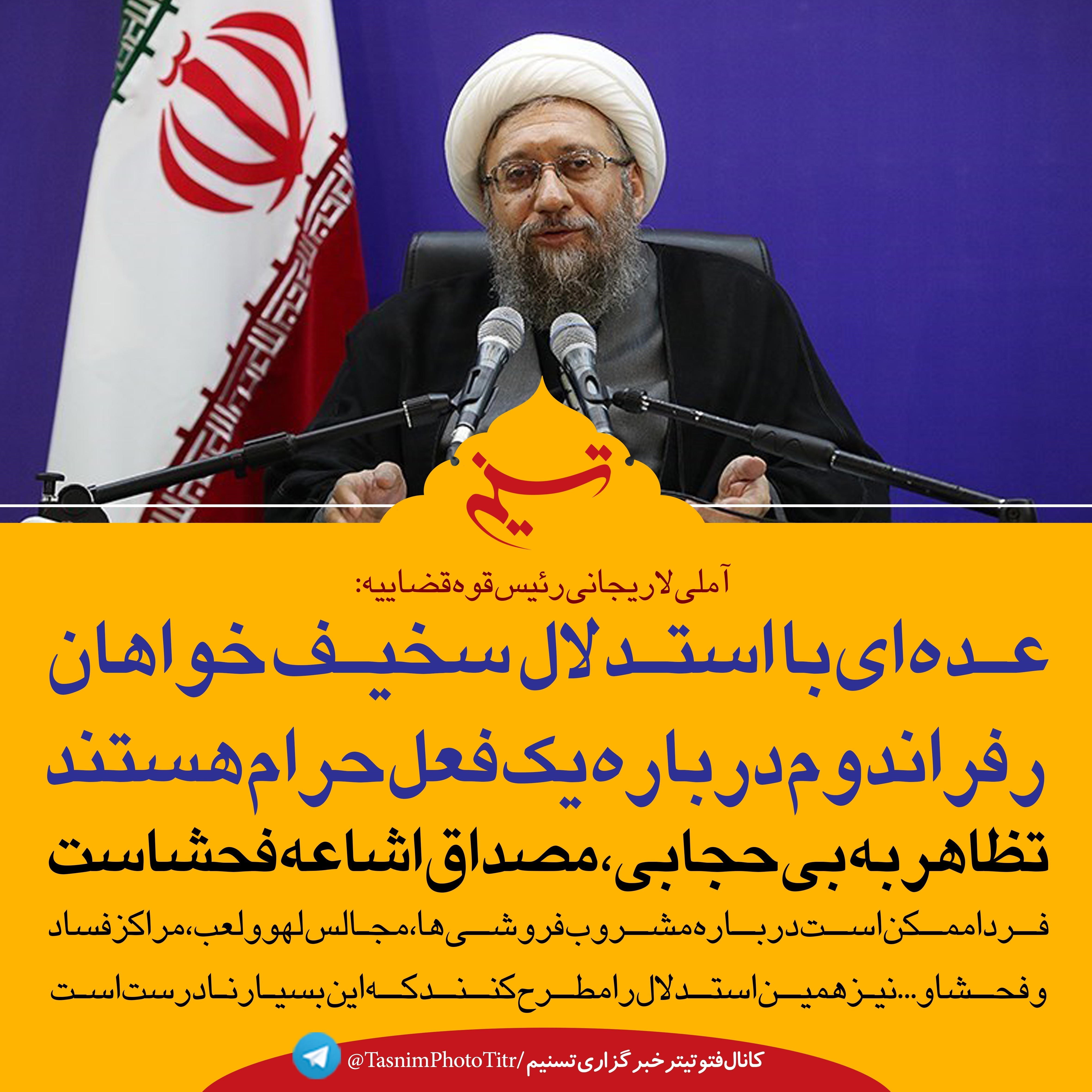 رئیس قوه قضاییه با بیان اینکه برخی خواص درخصوص مسئله حجاب بر طبل دشمن می‌کوبند گفت:با استدلال بسیار سخیفی می‌گویند درباره این موضوع رفراندوم برگزار کنید. سخنشان این است که حکومت اسلامی برای تجویز ارتکاب یا عدم ارتکاب یک فعل حرام رفراندوم برگزار کند.