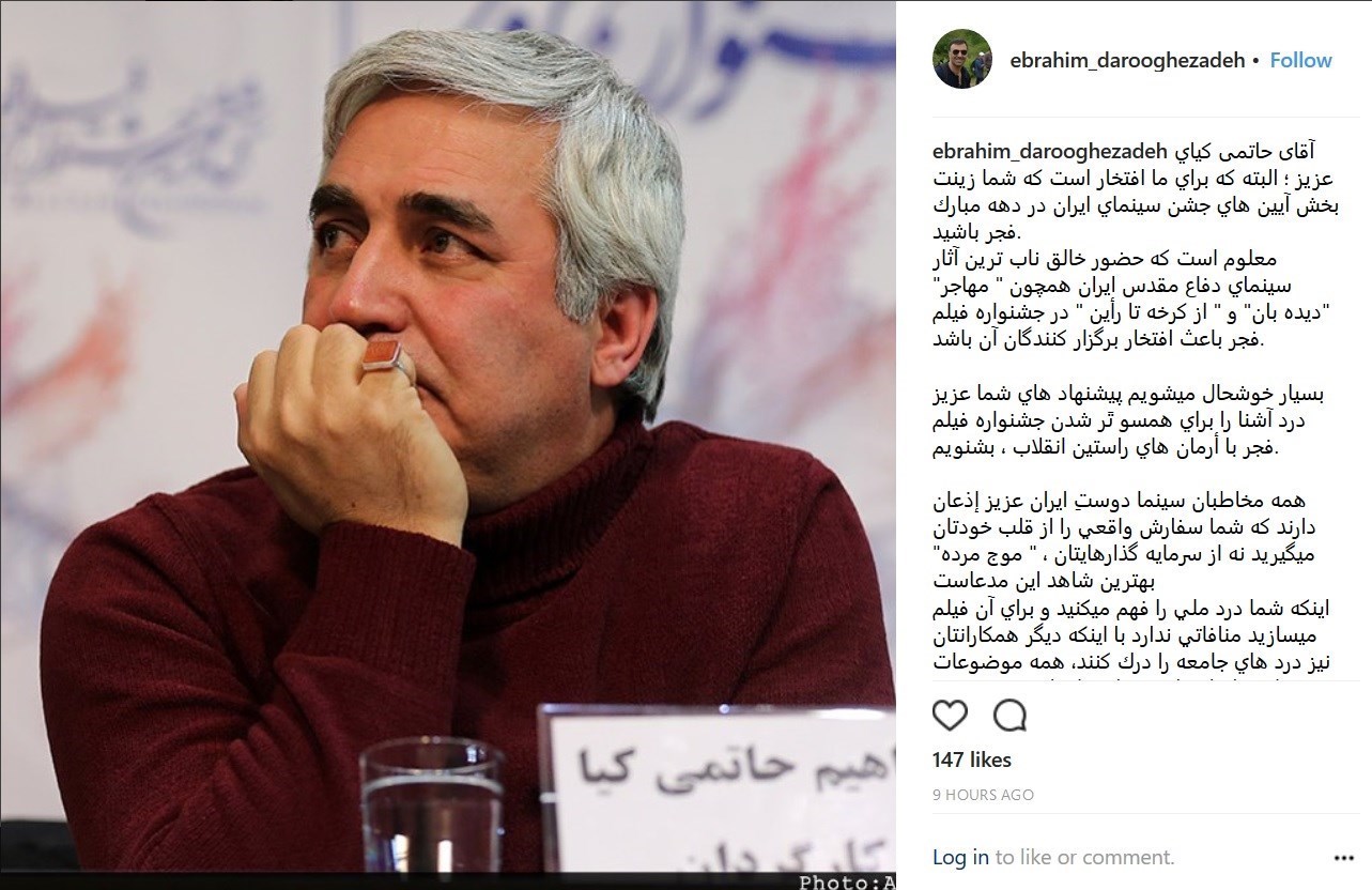 «آقای حاتمی کیای عزیز ؛ البته که برای ما افتخار است که شما زینت بخش آیین های جشن سینمای ایران در دهه مبارک فجر باشید.