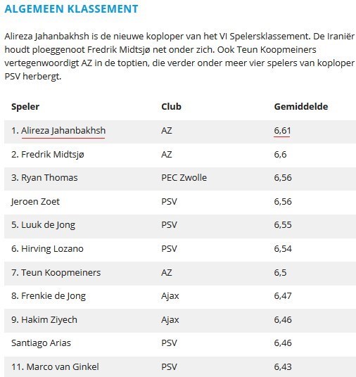 در فهرست برترین بازیکنان فصل 2018 - 2018 اردویژه هلند علیرضا جهانبخش، ملیپوش ایرانی تیم آلکمار با معدل امتیازی 6.61 رتبه نخست را به خود اختصاص داده است. 8 بازیکن از تیمهای آلکمار و آیندهوون در جمع 20 بازیکن برتر این رقابتها حضور دارند.