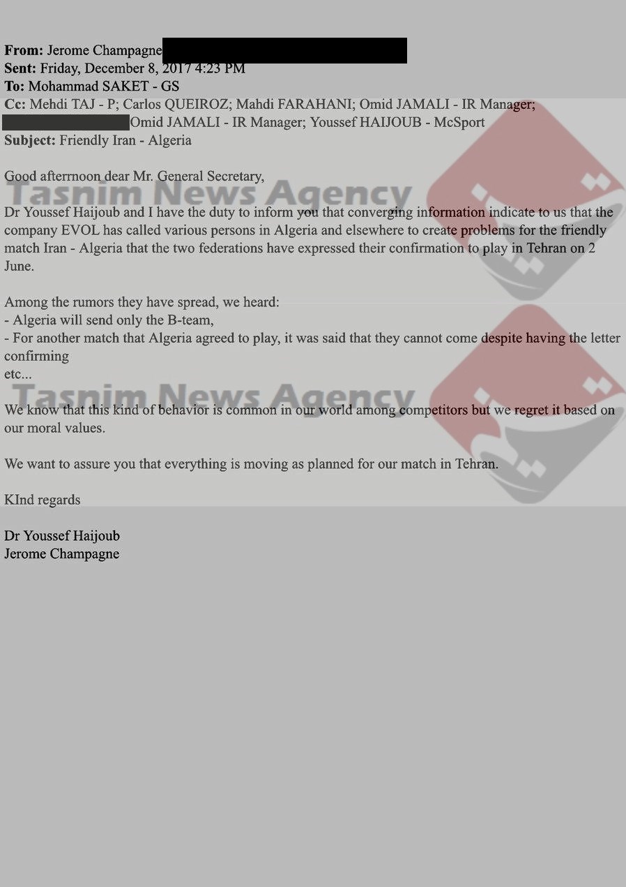 نکته جالب اینجاست ایجنتهایی که هماهنگی دیدار ایران و الجزایر را در تاریخ 12 خردادماه 97 هماهنگ کرده بودند، 8 دسامبر 2017 (17 آذرماه 96) ایمیلی خطاب به محمدرضا ساکت، دبیرکل فدراسیون فوتبال ارسال میکنند. رونوشت این ایمیل که از طرف ژروم شامپانیه نامزد پیشین ریاست فیفا نیز برای افراد مختلفی از جمله مهدی تاج، کارلوس کیروش و... ارسال میشود. در این ایمیل آمده است: (یوسف حجیوب که در زیر به نامش اشاره شده رئیس شرکت McSport است که دیدار ایران و الجزایر را برای تاریخ 2 ژوئن (12 خرداد 97) هماهنگ کرده بود.)