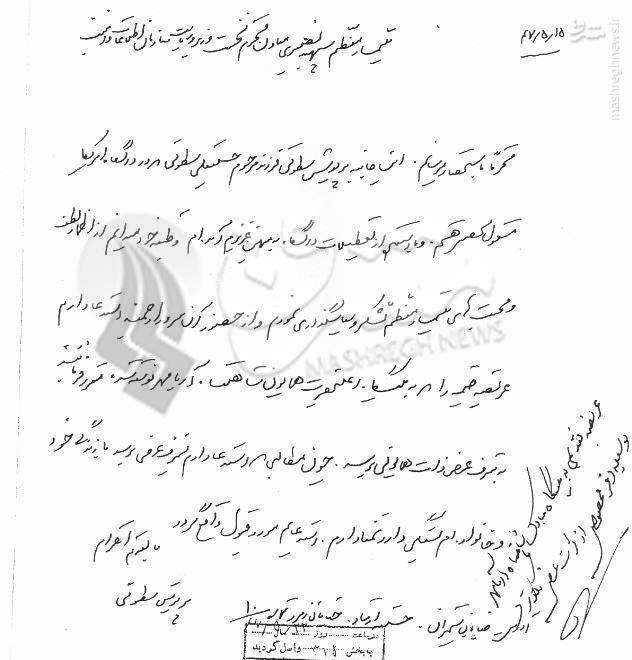 2- یک بلیط دو سره هواپیما جهت مسافرت فرزندش از انگلستان به ایران در اختیار وی گذارده شود تا به حضور شاهنشاه آریامهر شرفیاب و همچنین پیشرفتها و ترقیات کشور را مشاهده نماید.