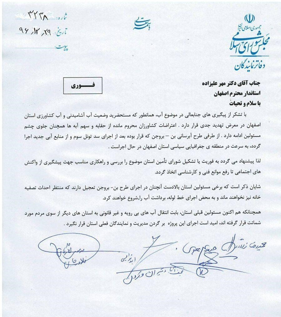 در بخشی از این نامه آمده است: «وضعیت آب آشامیدنی و آب کشاورزی استان اصفهان در معرض تهدید جدی قرار دارد. اعتراضات کشاورزان محروم مانده از حقابه و سهم آبهها هم چنان جلوی چشم مسئولان ادامه دارد. از طرفی طرح آبرسانی بن- بروجن که قرار بوده بعد از اجرای سد تونل سوم و از منابع آبی جدید اجرا شود به سرعت در منطقه جغرافیایی سیاسی استان اصفهان در حال اجراست.