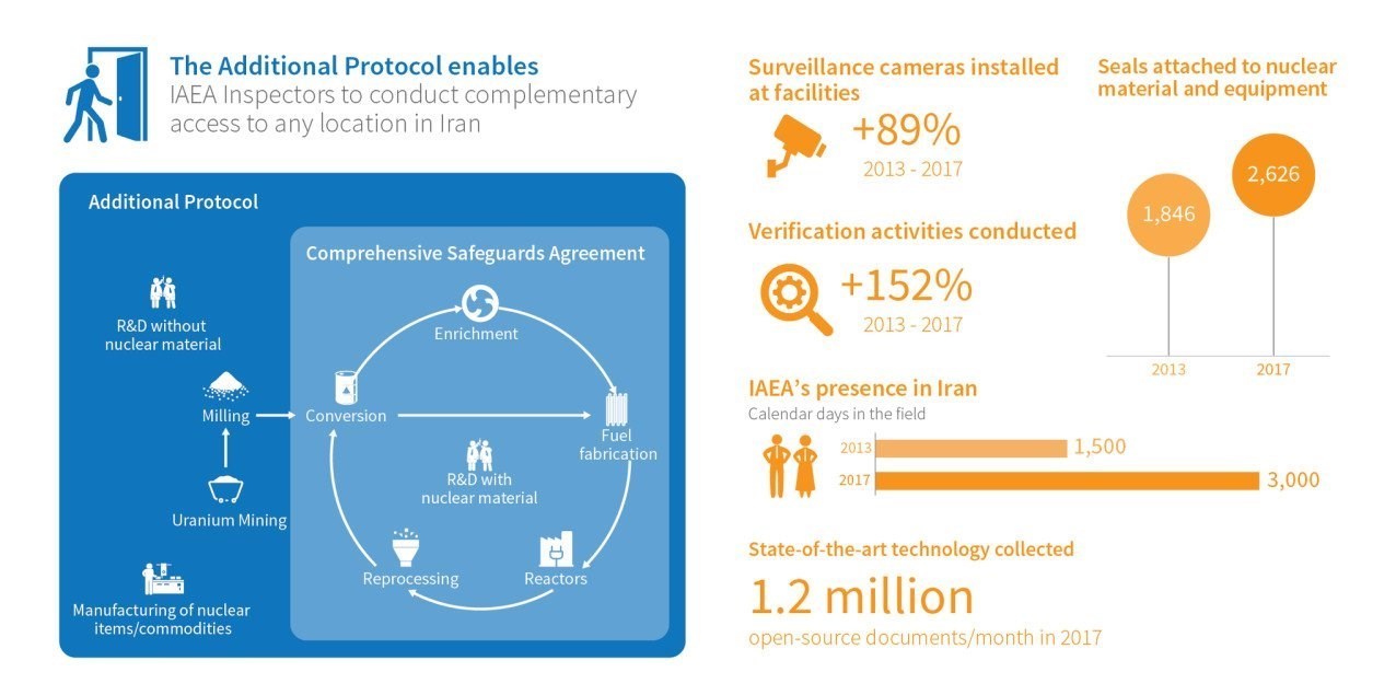 - افزایش حضور نمایندگان و بازرسان آژانس در ایران از 1500 نفر/روز در سال 2013 به 3000 نفر/روز در سال 2017