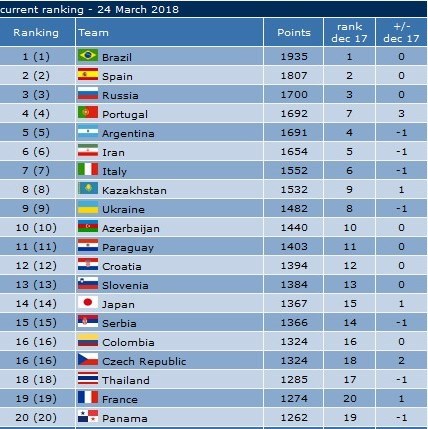 در این رنکینگ تیمهای برزیل، اسپانیا، روسیه، پرتغال و آرژانتین بهترتیب تیمهای اول تا پنجم جهان هستند.