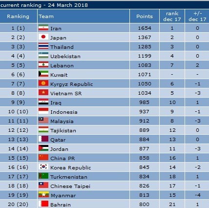 ردهبندی 20 تیم برتر قاره آسیا نیز بهشرح زیر است: