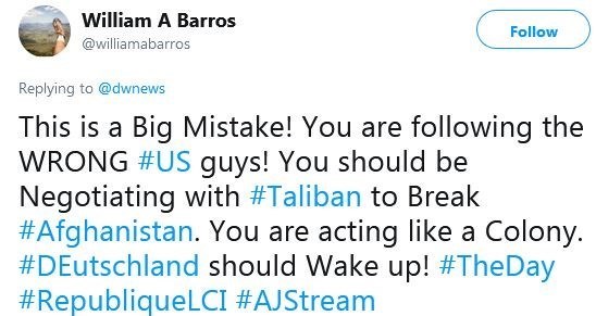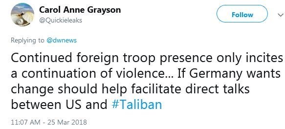 کاربر دیگر نیز اظهار داشت افزایش مداوم حضور نظامیان خارجی منجر به ادامه خشونتها در افغانستان میشود و اگر آلمان خواستار تغییر در وضعیت کنونی این کشور است باید گفتوگوی مستقیم آمریکا و طالبان را تسهیل کند.