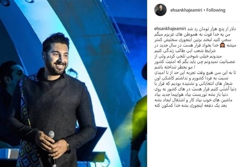 به گزارش گروه رسانه های خبرگزاری تسنیم، احسان خواجه امیری، خواننده پاپ کشورمان با انتشار تصویری در صفحه شخصی اینستاگرام نوشت: