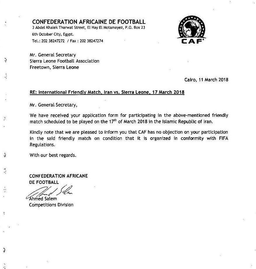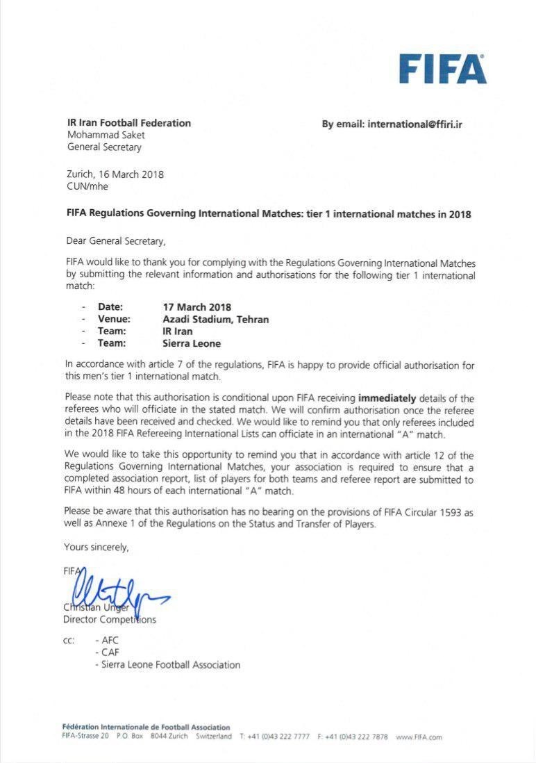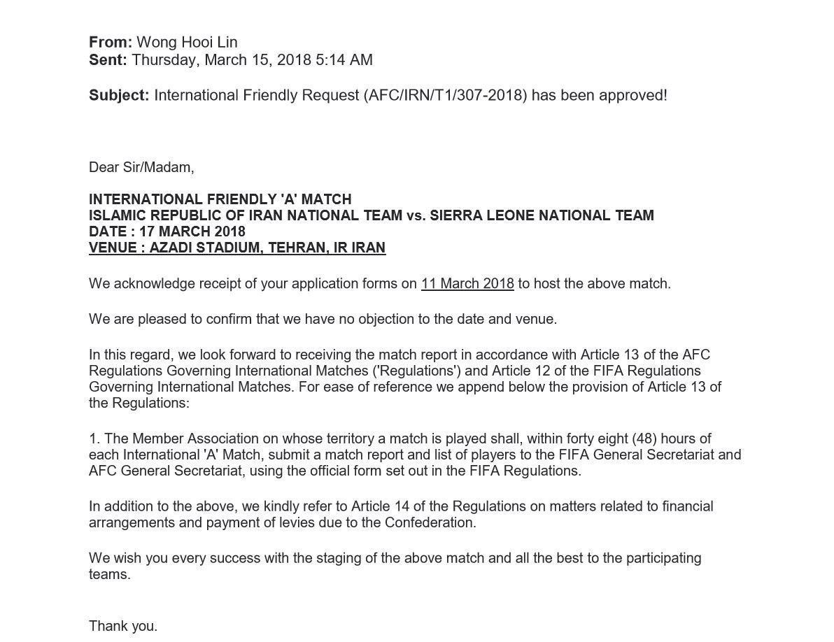 تصاویر مکاتبات مربوط به هماهنگی دیدار دوستانه ایران - سیرالئون در زیر میآید: