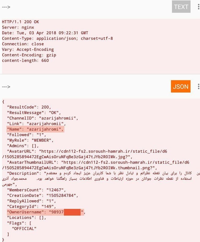 میلاد نوری در کانال تلگرامی خود نوشت: به درخواست دوستان اپلیکیشن پیامرسان سروش را بررسی کردم؛ سروش در یک اقدام بسیار غیرحرفهای از شماره موبایل افراد به عنوان آیدی استفاده کرده و در پاسخ وب سرویسها، شما میتوانید شماره موبایل مدیران کانالها و اعضای گروهها را مشاهده کنید.