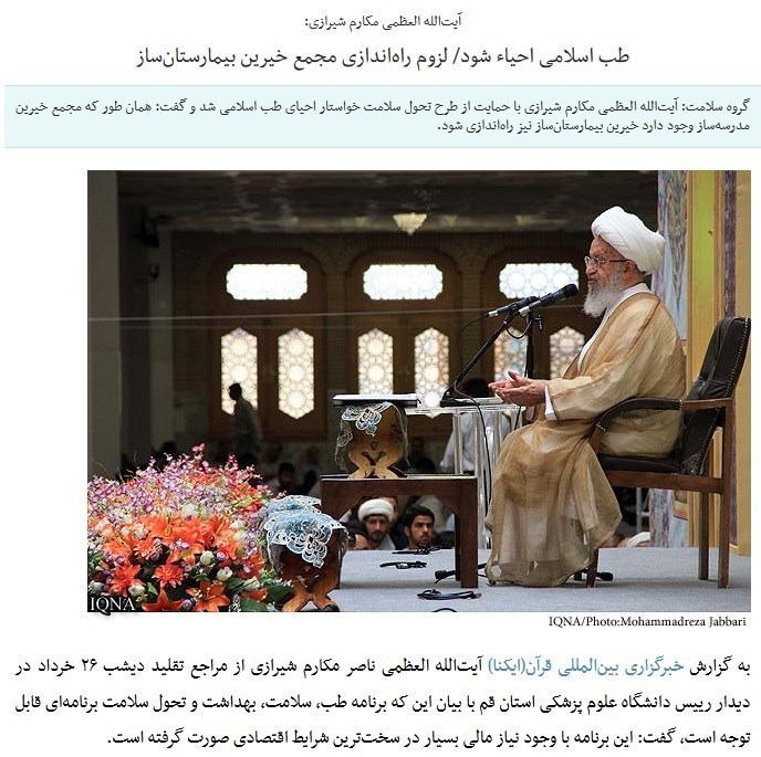 اما رجوع به اصل اظهارات این مرجع در دیدار اخیر با وزیر بهداشت که توسط پایگاه اطلاعرسانی آیتالله مکارم شیرازی منتشر شده، حقیقت دیگری را نشان میدهد؛ معظمله در این دیدار درباره مسئله طب اسلامی اظهار داشتهاند: "در قرآن و روایات دستوراتی وجود دارد اما طب اسلامی گفته نمیشود، طبی که امروز وجود دارد طب سنتی نام دارد، دستوراتی وجود دارد که اگر منابع معتبر باشد میتوان عمل کرد".