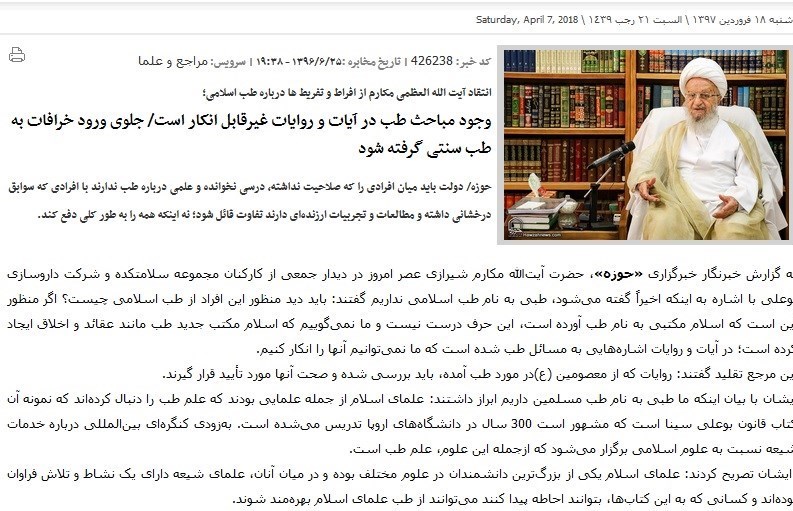 در بخشی از مطلب ناصحیح منتشره به نقل از آیت الله مکارم شیرازی آمده است: "جمعی از مدعیان طب اسلامی بهدیدار ما آمدند اما به آنها گفتم چیزی به نام طب اسلامی نداریم و باید از طب سنتی حرف بزنید چون اسلام، طب نیاورده است؛ در روایات و احادیث اهل بیت(ع) چیزی بهنام طب اسلامی وجود ندارد و برخی با یک مشت خرافات، به اسلام و طب سنتی آسیب میزنند".