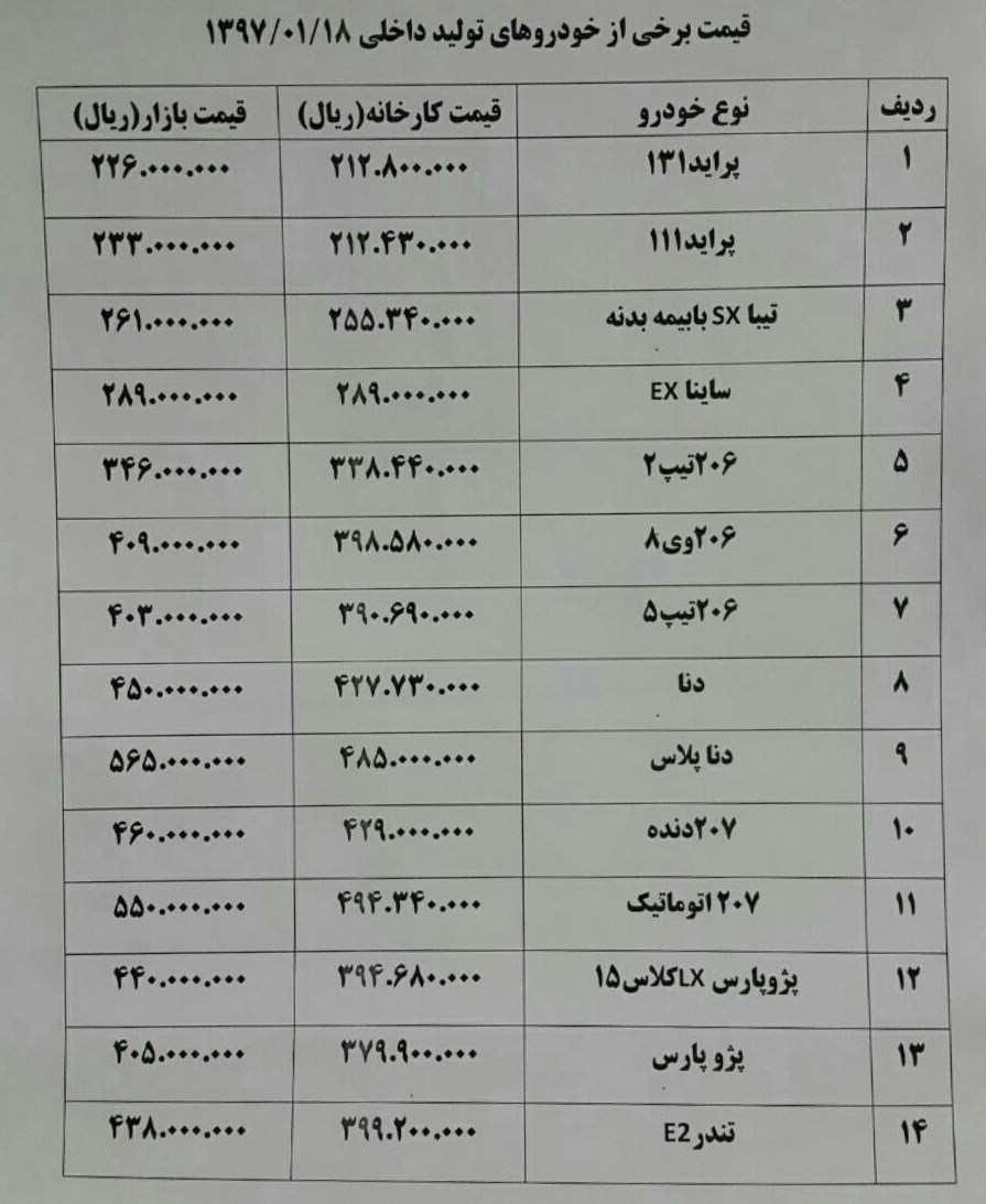 جدول تعدادی از خودروهای داخلی در بازار امروز بهشرح زیر است: