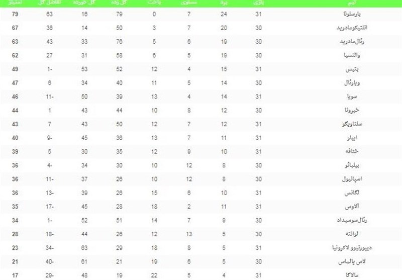 جدول ردهبندی لالیگا در پایان شب دوم هفته سی و یکم را در زیر مشاهده کنید.