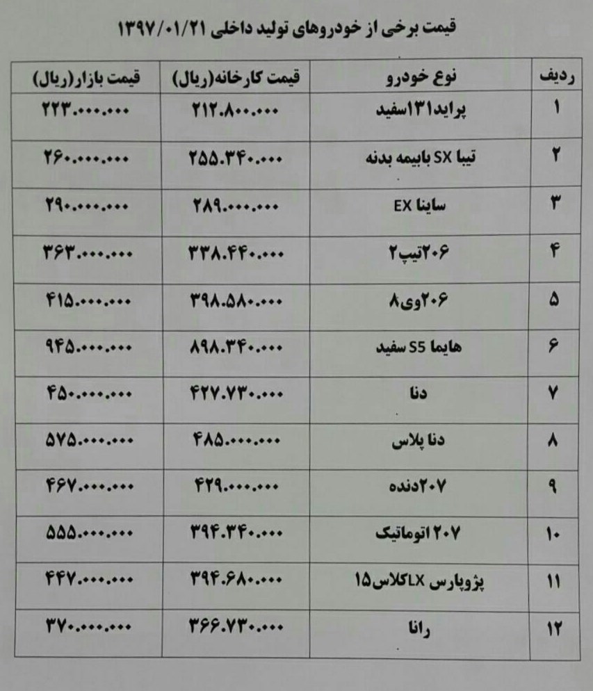 قیمت تعدادی از خودروهای داخلی در بازار امروز بهشرح زیر است: