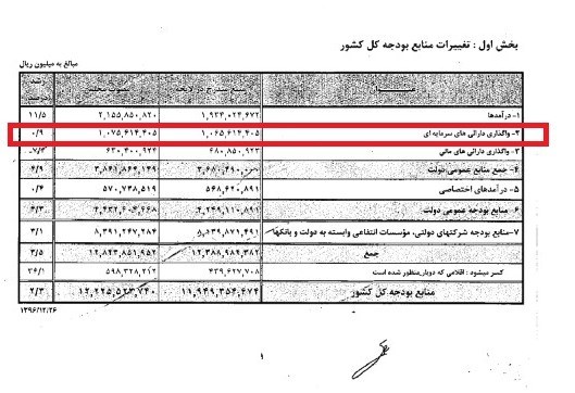 بنابراین حدود 49.5 درصد درآمدهای نفتی در اختیار دولت نبوده و دولت میتواند از 50 درصد درآمد نفتی سالیانه کشور برای تأمین منابع مورد نیاز خود استفاده کند. از طرفی بر اساس جدول زیر در قانون بودجه 97، درآمد دولت از محل واگذاری داراییهای سرمایهای که بخش عمدهای آن از محل فروش نفت است 107 هزار میلیارد تومان ذکر شده است. سقف منابع حاصل از نفت در لایحه و قانون بودجه نیز 101 هزار میلیارد تومان ذکر شده است.