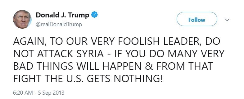 این در حالی است که ترامپ در سال 2013، زمانی که باراک اوباما رئیس جمهور آمریکا بود در توییتی نوشته بود «دوباره به رهبر خیلی احمقمان میگویم، به سوریه حمله نکنید- اگر حمله کنید اتفاقات بسیار بد زیادی رخ خواهند داد و از آن جنگ چیزی عاید آمریکا نمیشود.»