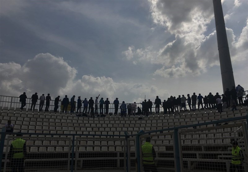 * در قسمت روبروی جایگاه حدود 30 هوادار نشستهاند که به نظر میرسد هوادار گسترش فولاد هستند، اما در واقع تیم تراکتورسازی را تشویق میکنند.