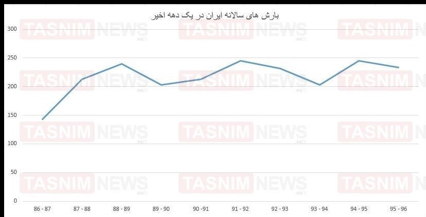 متوسط بارش های سالانه ایران به صورت درازمدت (متوسط نیم قرن اخیر) 10 سال پیش 254 میلیمتر بود، این رقم در پایان سال آبی 95 – 96 به 249.7 میلیمتر رسید.