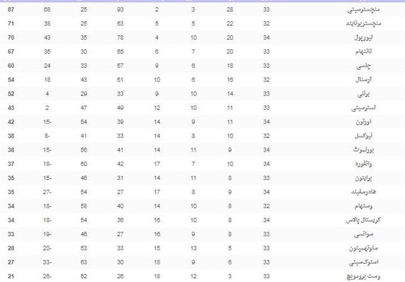 در زیر جدول دردهبندی لیگ برتر انگلیس در پایان شب اول هفته سی و چهارم را مشاهده کنید.