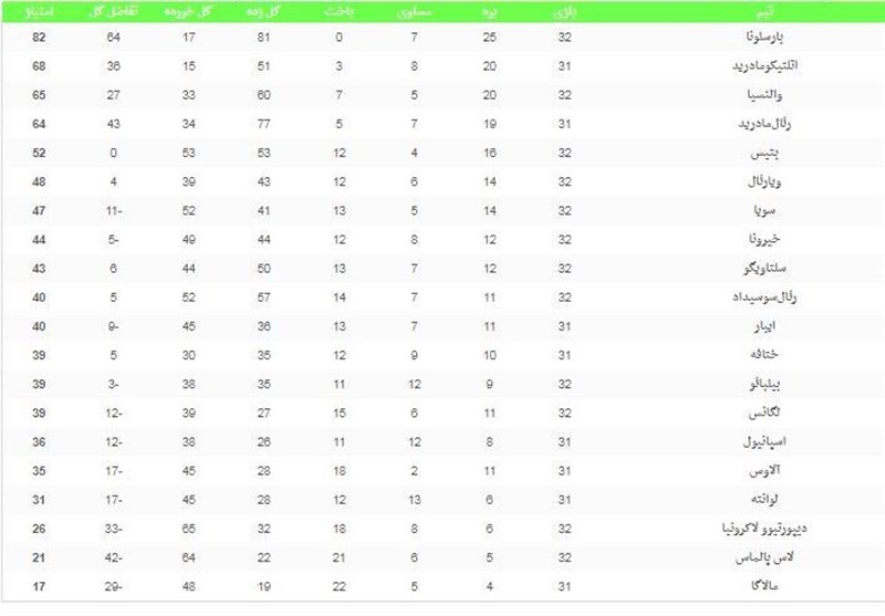 در زیر جدول ردهبندی لالیگا در پایان شب دوم هفته سی و دوم را مشاهده میکنید.