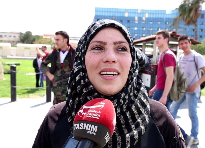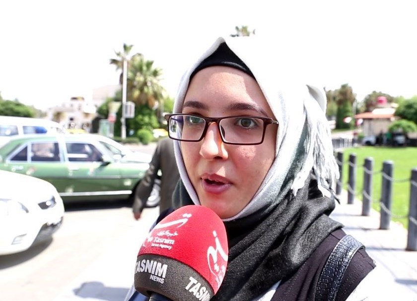 این زن سوری در مورد این سؤال که "چهحرفی برای کشورهای متجاوز دارید؟" پاسخ داد: به آنان میگویم هرکاری کردید موجب ترس ما نشد، ما با ملت و رئیس جمهور خود قوی هستیم و از متحدان سوریه تشکر میکنم و میگویم ما یک ملت واحد هستیم و در خون و پیروزی شریکیم.