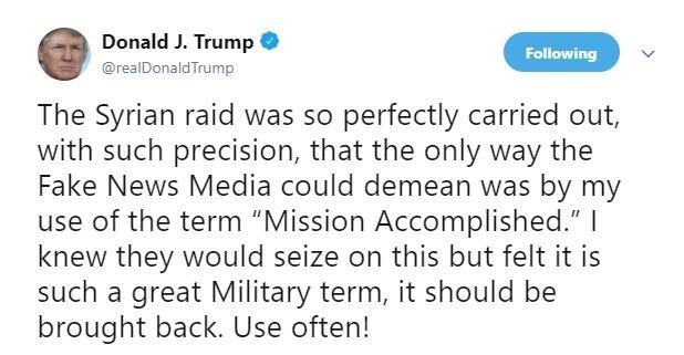 به گزارش گروه بینالملل خبرگزاری تسنیم، دونالد ترامپ، رئیس جمهوری آمریکا در پیامی توئیتری مدعی شد که «یورش [به] سوریه آنچنان بینقص و با دقت انجام شد که تنها راه رسانههای جعلی برای اینکه بتوانند آن را تحقیر کنند، استفاده من از عبارت "مأموریت انجام شد" بود».