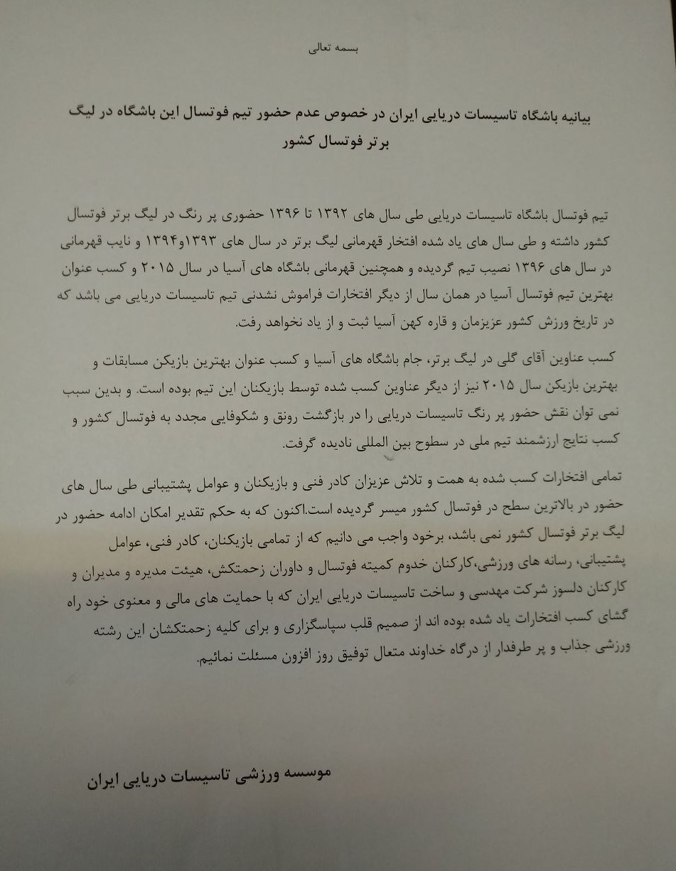 باشگاه تأسیسات دریایی تهران در این مورد بیانیهای صادر کرده است که تصویر آن در زیر میآید:
