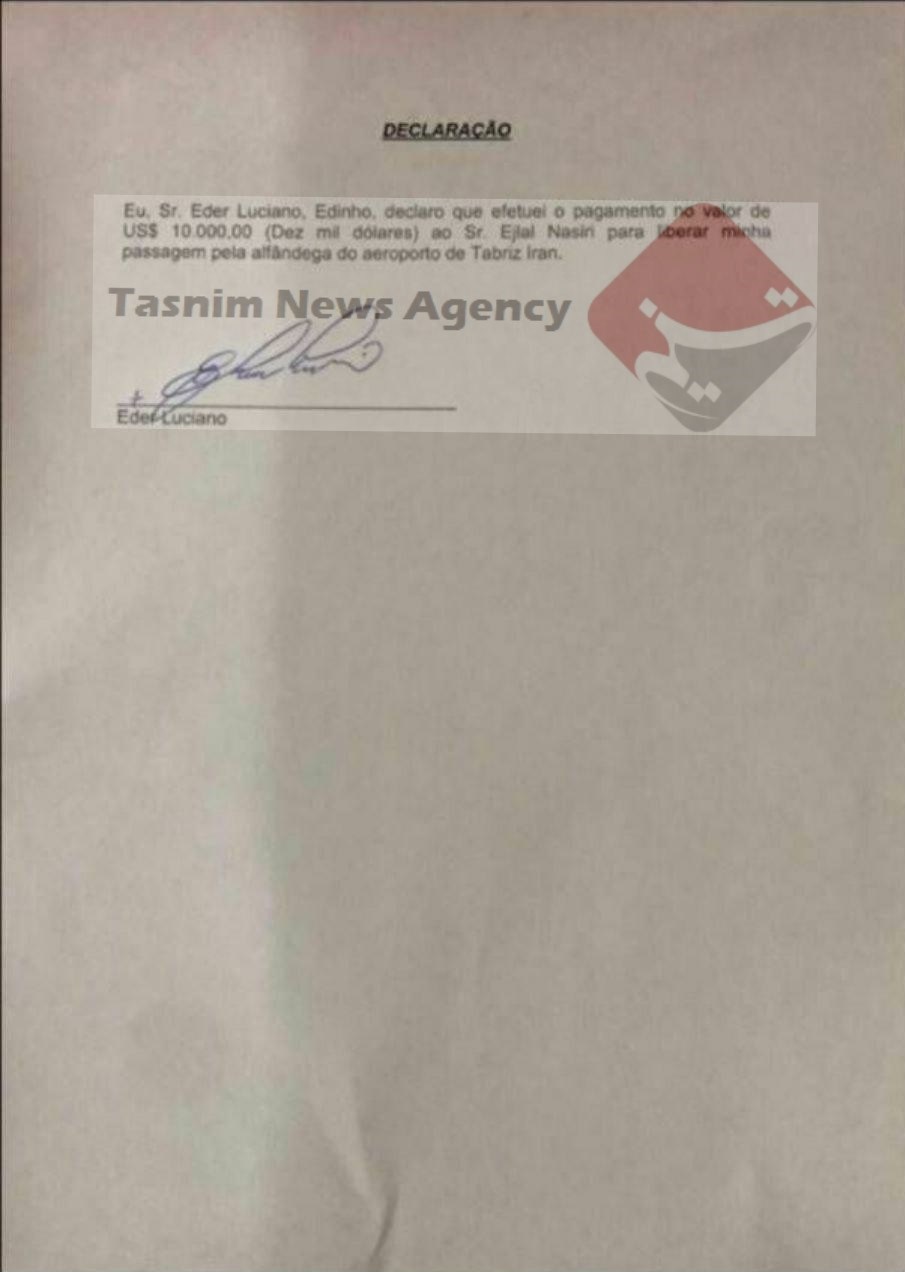 اکنون اما نامهای منتشر شده که این بازیکن در هنگام خروج از ایران مبلغ 10 هزار دلار به «اجلال نصیری» مدیر اجرایی باشگاه تراکتورسازی پرداخت کرده است. در این نامه که به زبان برزیلی نوشته شده، آمده که این پول به نصیری داده شده است.