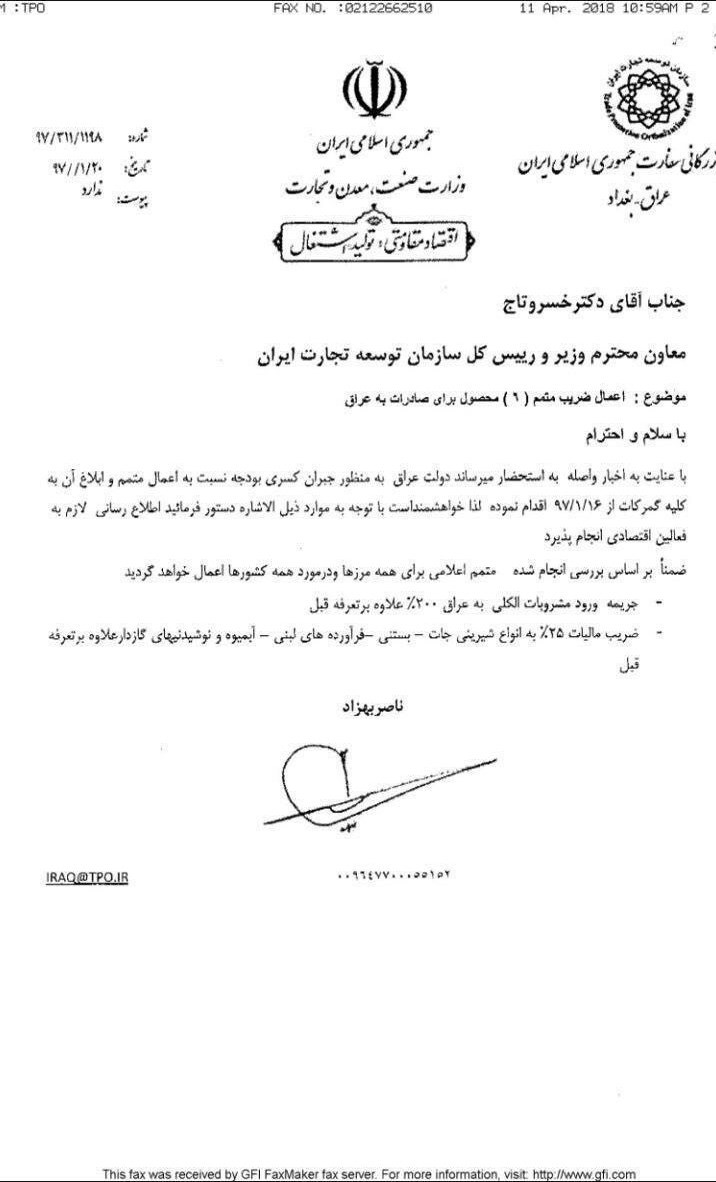 به گزارش خبرنگار بازرگانی خبرگزاری تسنیم، ناصر بهزاد، رایزن بازرگانی ایران در عراق با ارسال نامه‌ای به خسرو تاج رئیس سازمان توسعه تجارت اعلام کرد که کشور عراق به‌منظور جبران کسری بودجه خود نسبت به اعمال متمم و ابلاغ آن به کلیه گمرکات از تاریخ 16  فروردین 97 اعمال نموده است.