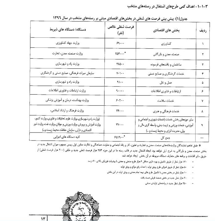 سال 97 که با درایت مقام معظم رهبری به نام سال حمایت از کالای ایرانی نامگذاری شده، فرصت مغتنمی است که به سیاست های اشتغالی کشور که به طور مستقیم متأثر از حمایت از کالای ساخت داخل است، پرداخته شود، دولت در قالب سیاست های اشتغال فراگیر برنامه اشتغالزایی خود از سال گذشته آغاز و امسال نیز با تغییرات جزئی دنبال می کند.پیش بینی فرصت های شغلی در بخش های اقتصادی مبتنی بر رسته های منتخب در سال 96 به شرح زیر است.