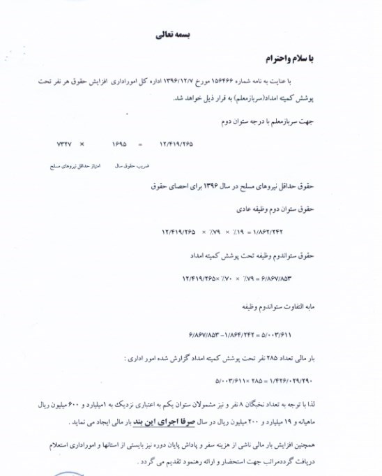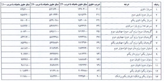 در این بخشنامه آمده است: پیرو بخشنامه مورخ 22 آبان 96 معاون توسعه روستایی و مناطق محروم کشور، معاون اول رئیسجمهور و تصویرنامه مورخ 21 بهمن 96 دفتر سیاستگذاری و نظارت راهبردی حفاظت اطلاعات نیروهای مسلح از تاریخ اول آذر 96 حقوق کارکنان وظیفه مامور براساس جدول ذیل قابل پرداخت است.