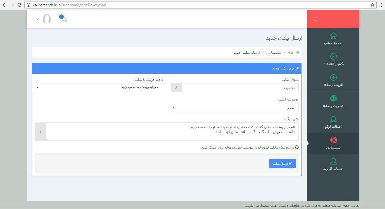 بر این اساس http://site.samandehi.ir/Dashboard/AddTicket.aspx برای متقاضیان مهاجرت به پیامرسانهای داخلی در نظر گرفته شده که مطابق تصویر زیر باید درخواستشان را در پنل مربوط به خود تیکت بزنند: