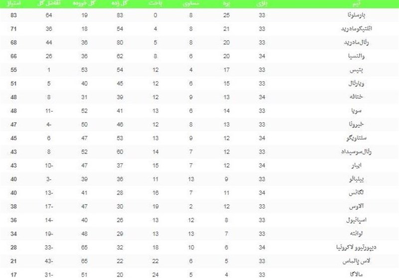جدول رده‌بندی لالیگا در پایان هفته سی‌وسوم