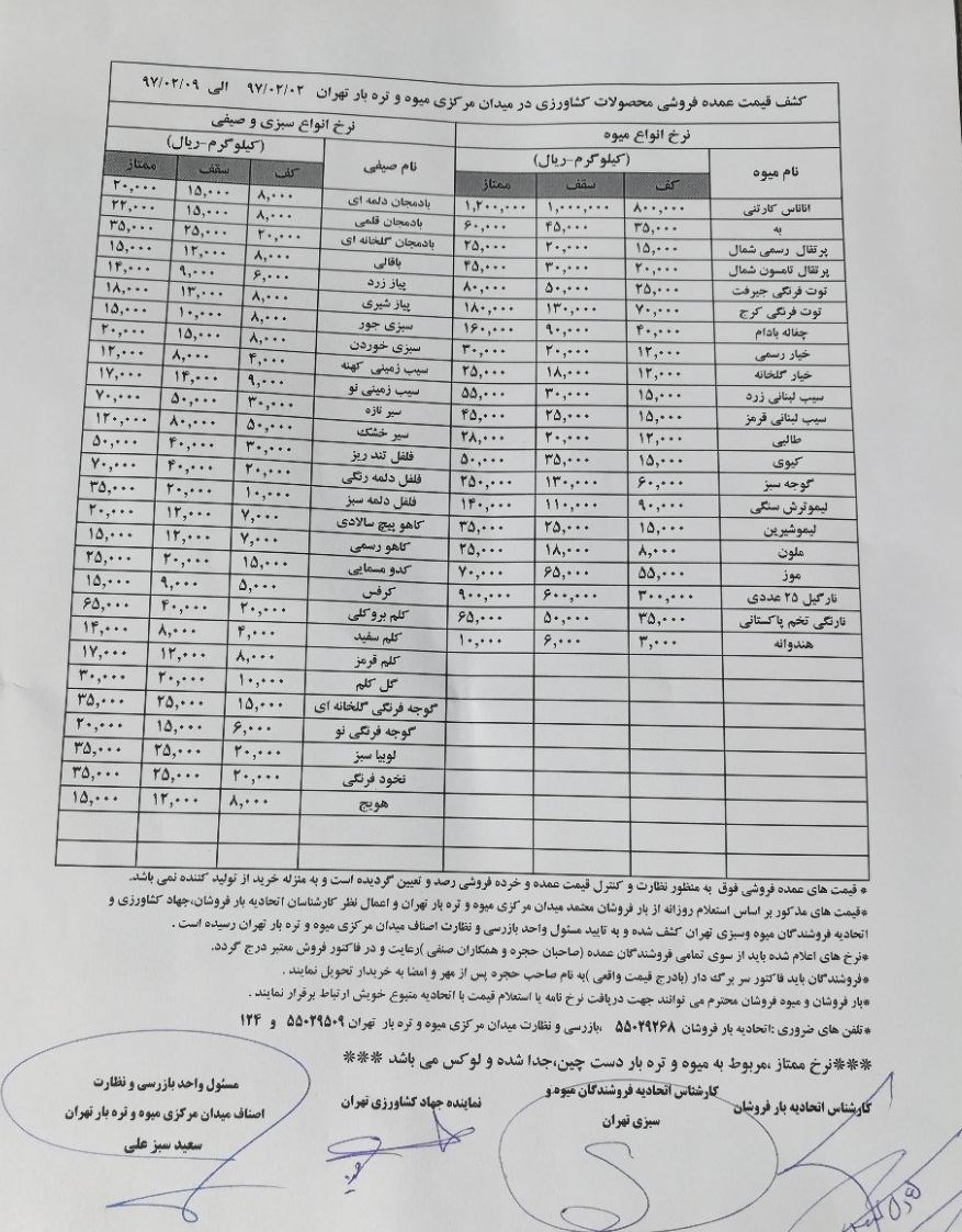 قیمتهای مذکور بر اساس استعلام روزانه از بارفروشان متعدد میدان مرکزی میوه و ترهبار تهران و اعمال نظر کارشناسان اتحادیه بارفروشان جهاد کشاورزی و اتحادیه فروشندگان میوه و سبزی تهران کشف شده و به تأیید واحدهای بازرسی و نظارت اصناف میدان مرکزی میوه و ترهبار تهران رسیده است.