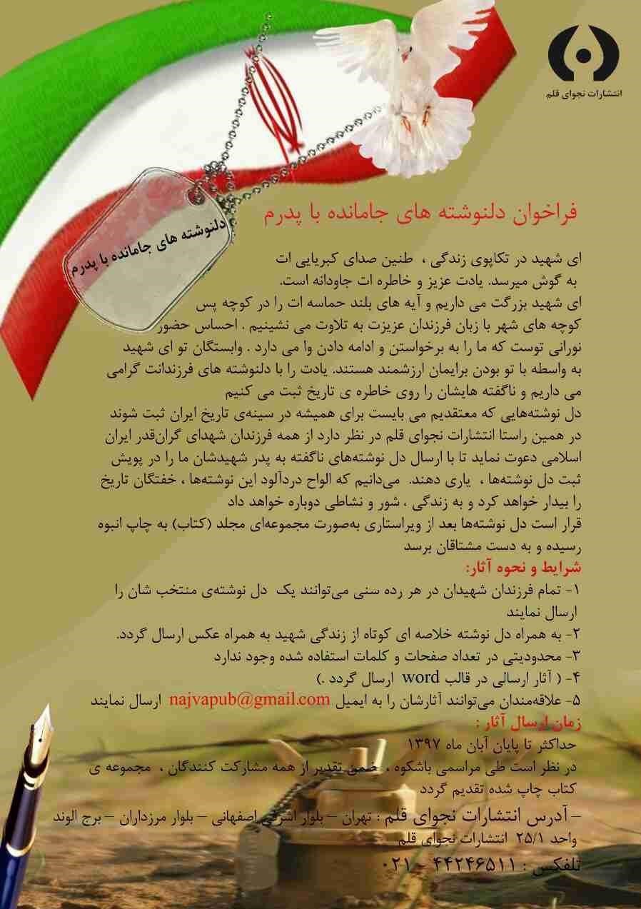به گزارش باشگاه خبرنگاران پویا, انتشارات نجوای قلم در فراخوانی از تمامی فرزندان شهدای گرانقدر ایران اسلامی دعوت کرد تا با ارسال دل نوشتههای ناگفته به پدر شهیدشان در پویش ثبت دل نوشتهها، شرکت کنند.قرار است دل نوشتهها بعد از ویراستاری بهصورت مجموعهای مجلد (کتاب) به چاپ انبوه رسیده و به دست مشتاقان برسد.