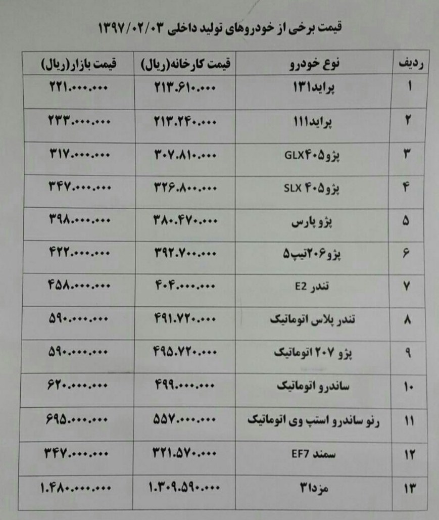قیمت تعدادی از خودروهای داخلی در بازار امروز بهشرح زیر است: