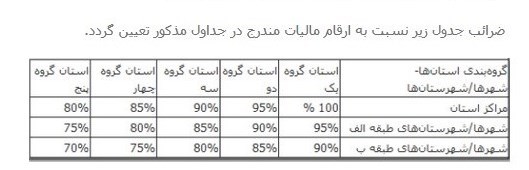 2- مالیات صاحبان وسایط نقلیه عمومی تا ظرفیت 7 تن موضوع جداول 3 الی 7 پیوست با توجه به تقسیمبندی فوق و بنابر اهمیت محل فعالیت با اعمال ضرائب جدول زیر نسبت به ارقام مالیات مندرج در جداول مذکور تعیین گردد.