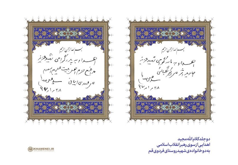 به گزارش گروه سیاسی خبرگزاری تسنیم به نقل از پایگاه اطلاعرسانی دفتر حفظ و نشر آثار حضرت آیتالله خامنهای، روز گذشته (جمعه هفتم اردیبهشتماه 97) در مراسم یادواره سرداران و 115 شهید روستای فردوی قم، دو جلد کلامالله مجیدِ اهدایی از سوی رهبر انقلاب اسلامی، به مادر شهید جاویدالاثر اکبر گلباشی و پدر شهید مدافع حرم اهلبیت علیهم السلام مهدی ایمانی تقدیم شد.