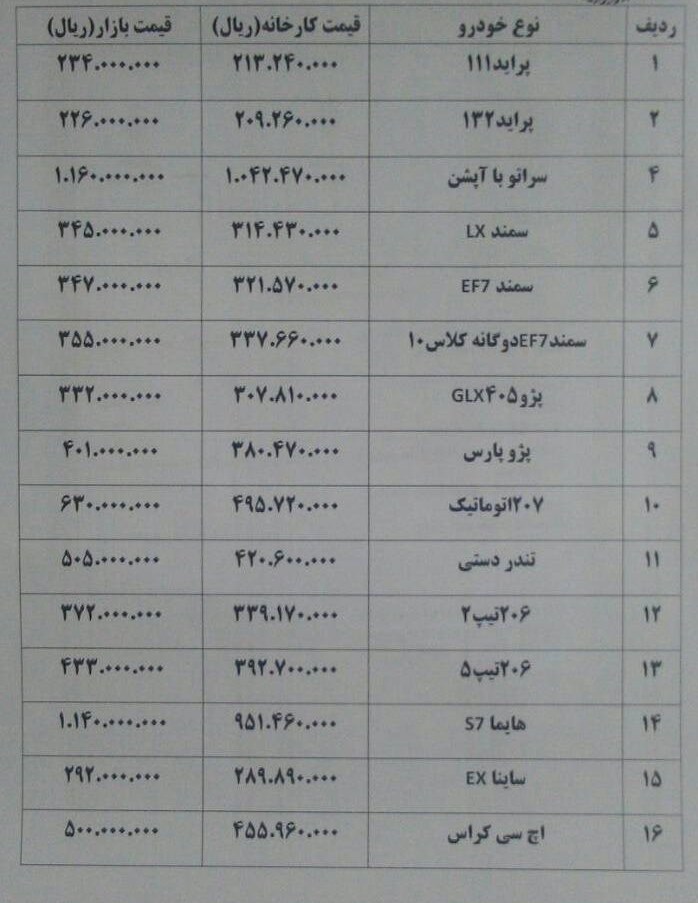 قیمت تعدادی از خودروهای داخلی در بازار امروز به شرح زیر است:
