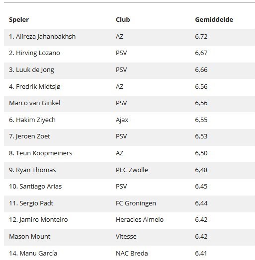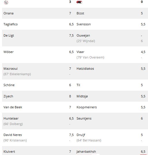 علیرضا جهانبخش، ملیپوش ایرانی تیم آلکمار نیز که 90 دقیقه در مصاف با آژاکس آمستردام حضور داشت نمره فنی متوسط 6.5 را از روزنامه فوتبال اینترنشنال دریافت کرد. آلکمار شکست 3 بر صفر را برابر آژاکسیها پذیرا شد.