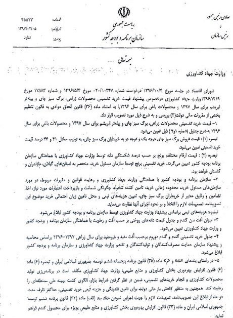 محمدباقر نوبخت رئیس سازمان برنامه و بودجه با ارسال نامهای به وزارت جهاد کشاورزی اعلام کرد: شورای رقابت در جلسهای مورخ96/10/14 درخواستی به جهاد کشاورزی در خصوص پیشنهاد قیمت خرید تضمینی محصولات زراعی برگ سبز چای و پیله ابریشم برای سال 1397 و محصولات باغی برای سال 1396 با استناد ماده 36 الحاق مواردی به قانون تضمین بخشی از مقررات مالی دولت بررسی و به شرح ذیل مورد تصویب قرار داد.