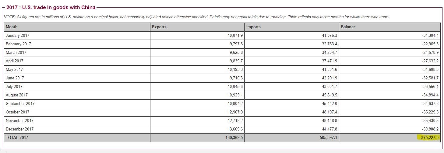 موضوعی که در این بین باید به آن توجه داشت تفاوت 375 میلیارد دلاری فاصله واردات و صادرات آمریکا از چین در سال 2017 است. (منبع: U.S. Census Bureau)