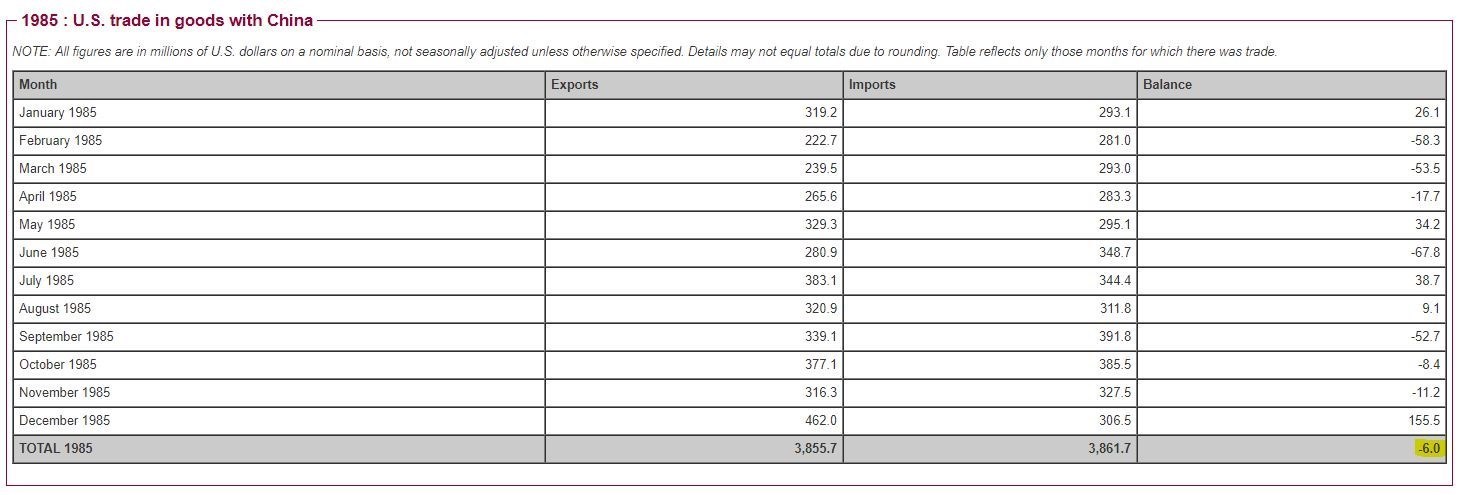 در سال 1985 میزان صادرات به چین و واردات از این کشور تقریبا برابر بود. این فاصله در سال 2009 به 240 میلیارد دلار رسید و اکنون شاهد اختلاف 375 میلیارد دلاری هستیم.