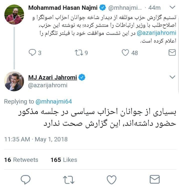 دقیقا زمانی که موضوع استعفای وزیر ارتباطات مورد توجه فضای مجازی و رسانهای قرار گرفته بود، روابط عمومی حزب موتلفه خبر دیدار شاخه جونان احزاب اصلاحطلب و اصولگرا با وزیر ارتباطات مبنی بر اینکه وزیر موافق فیلترینگ تلگرام است را منتشر کرد، خبرنگار روزنامه شرق نیز همین خبر روابط عمومی موتلفه را به نقل از خبرگزاری تسنیم توییت کرد که وزیر ارتباطات در واکنش به این خبر نوشت: این گزارش(روایت موتلقه از دیدارش با احزاب) صحت ندارد.