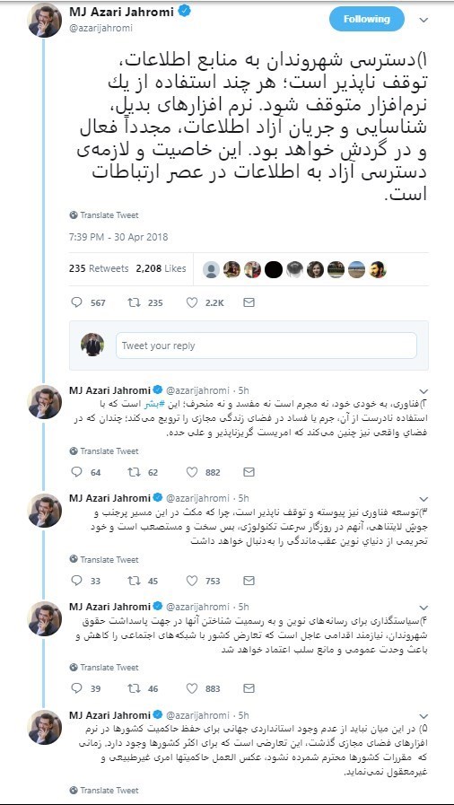 آذریجهرمی پس از مسدود شدن تلگرام در صفحه توییتر خود 5 توییت درباره این موضوع انجام داد؛