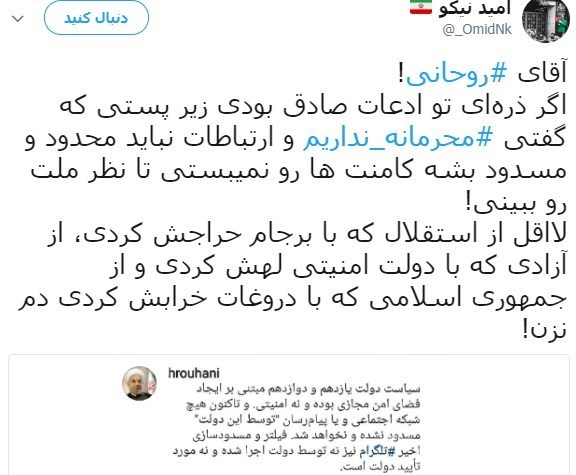 این متن از روحانی با هشتگ‌های #محرمانه_نداریم #حکم_سفارشی‌ #جریان_آزاد_اطلاعات و #حق_انتخاب تگ شده است.
