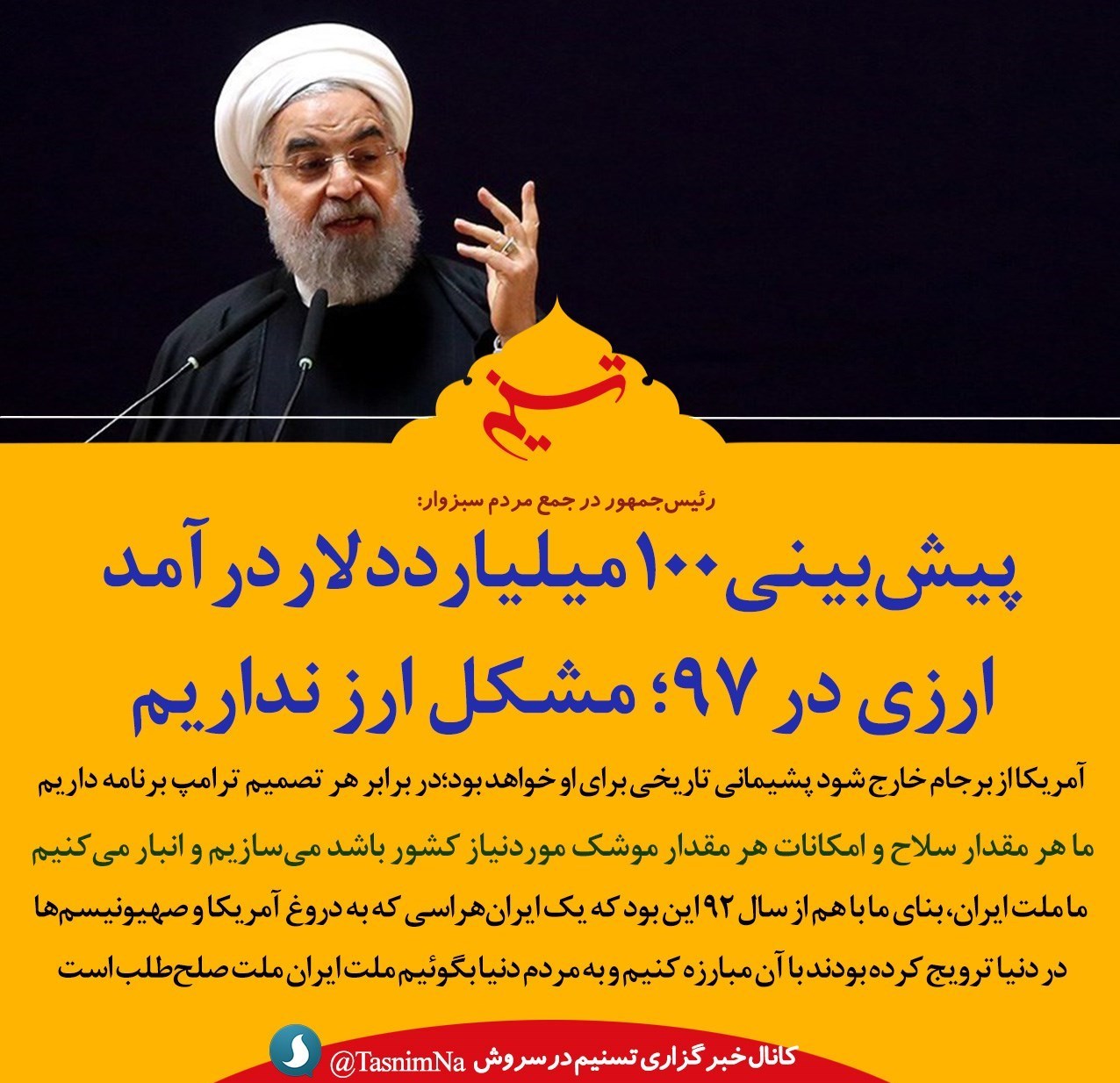 رئیس‌جمهور با تأکید بر اینکه آمریکا اگر بخواهد از برجام خارج شود به‌زودی خواهد دید که پشیمانی تاریخی برای او خواهد بود، گفت: در سال 97 طبق پیش‌بینی‌ها 100میلیارد دلار درآمد نفتی و غیرنفتی داشته و مشکل ارز برای امسال و اداره کشور به‌هیچ عنوان نداریم.